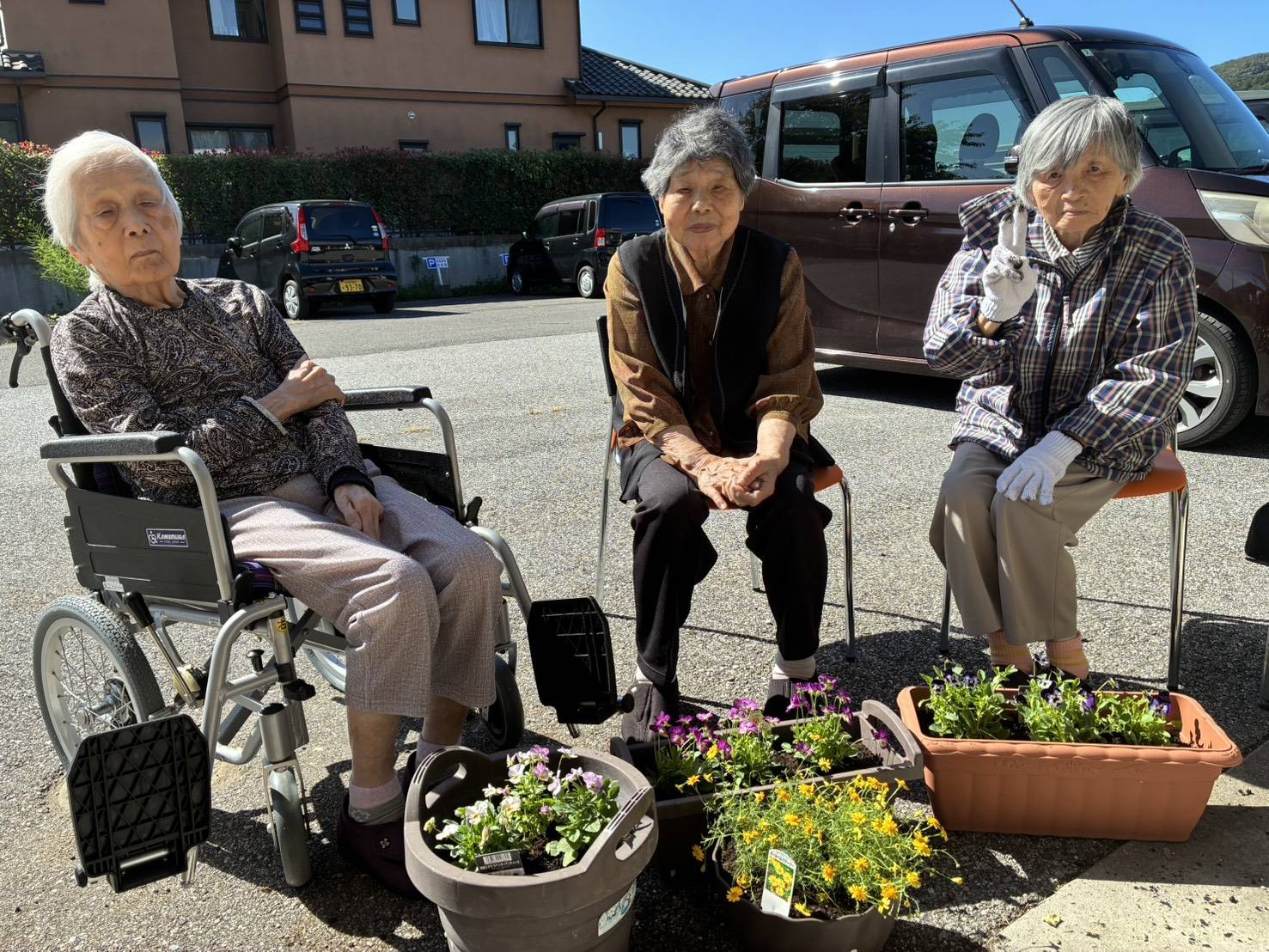 秋の風を感じながら、ご利用者様と職員が笑顔で協力し合い、プランターに色とりどりの花を植えました。