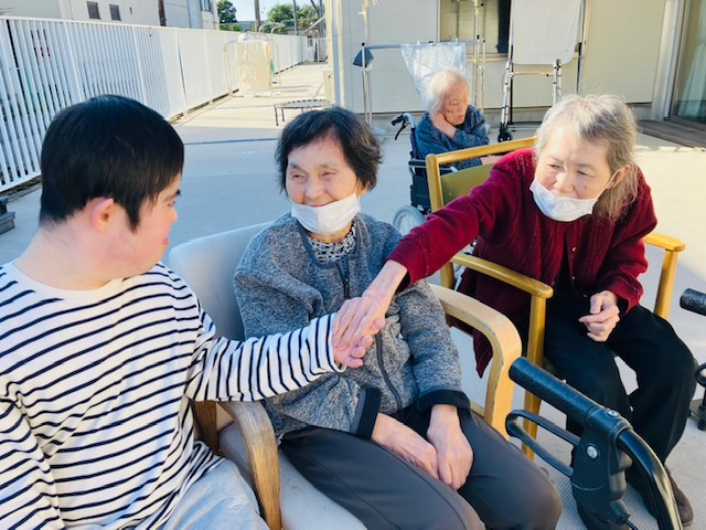 そんな中、日中のお天気良い日にテラスに出てお隣の大空の利用者様と楽しく日向ぼっこをしました!
