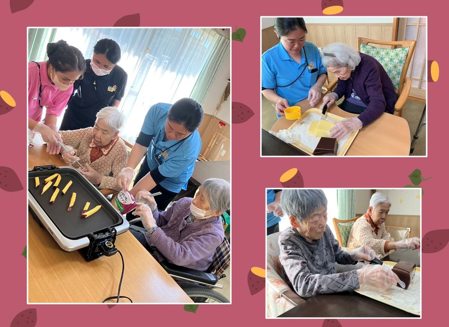 ホットプレートでサツマイモを焼いて、プリンか水ようかんを添えて、美味しいスイーツが完成しました❗️ タイの技能実習生さんも、初めてのスイーツ作りのレクリエーションを頑張りました。😄✨