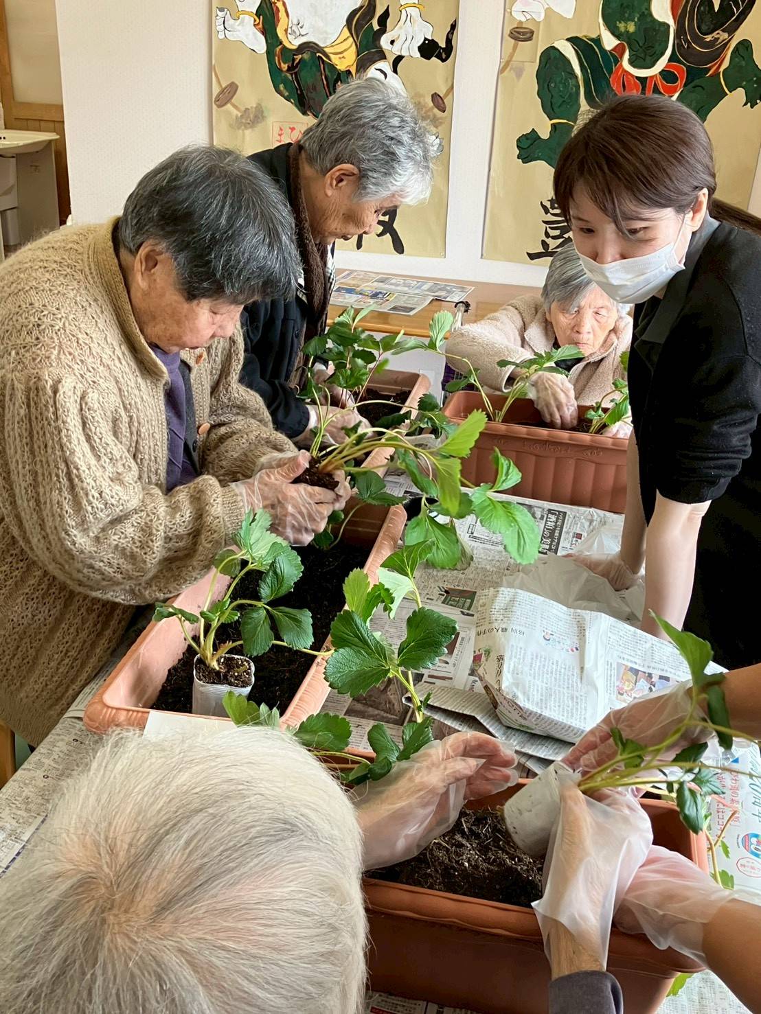 職員とご利用者様が一緒に土をならしたり、水をあげたりして、かわいい苗がずらりと並びました。