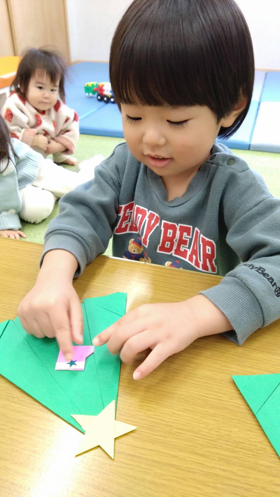 緑色の画用紙におりがみのお星さま🌟や、好きな色のブーツを貼りました。