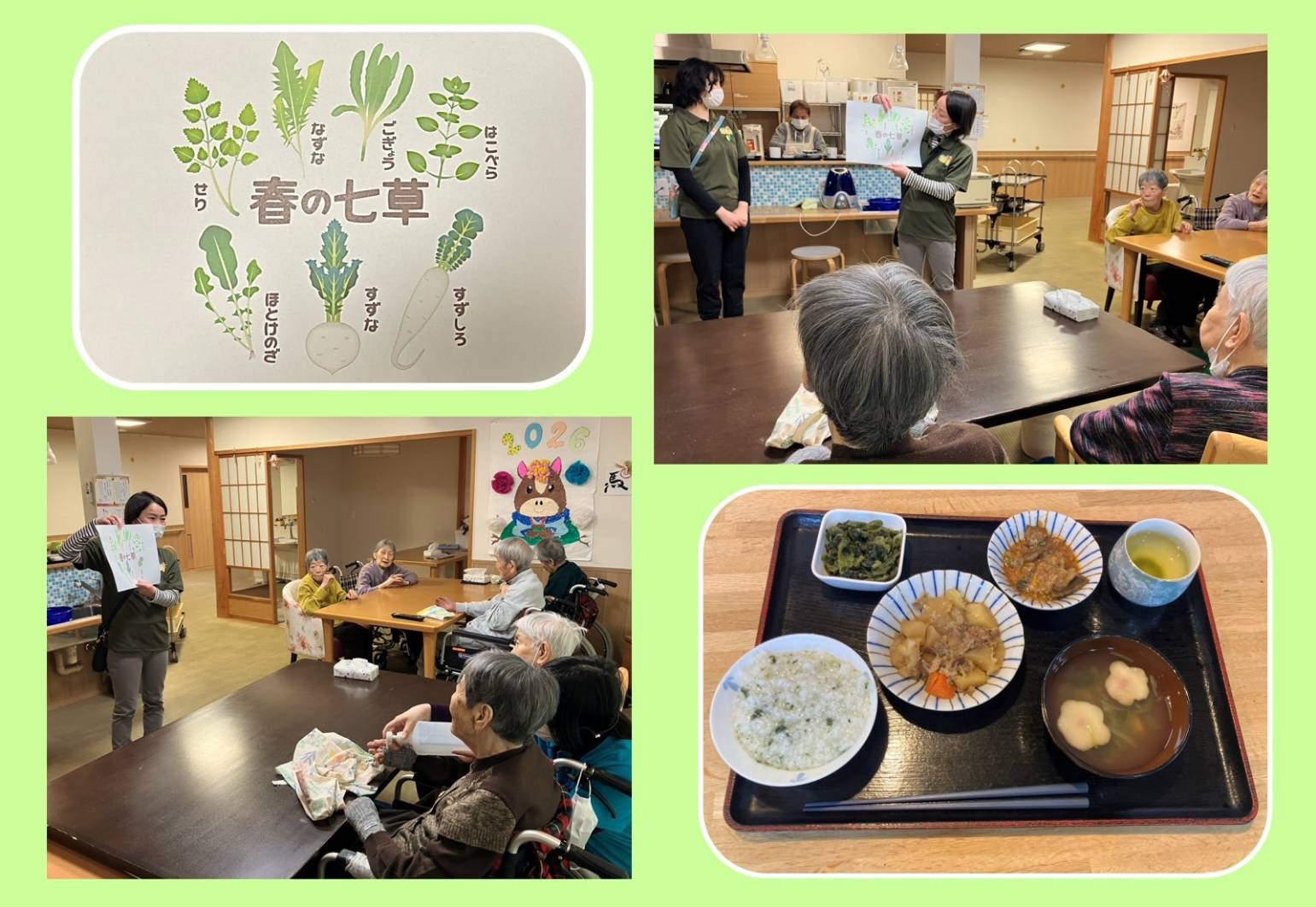 皆さま「春の七草 」は歌で覚えておられますので、当日の口腔体操は「せり・なずな・ごぎょう・はこべら・ほとけのざ・すずな・すずしろ」と元気に読み上げをしました😄