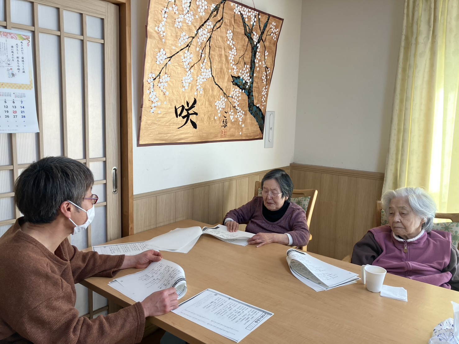レクリエーション担当職員は壁面飾り制作の腕も一級品で、後ろの桜の絵も作品の一つです❗️
