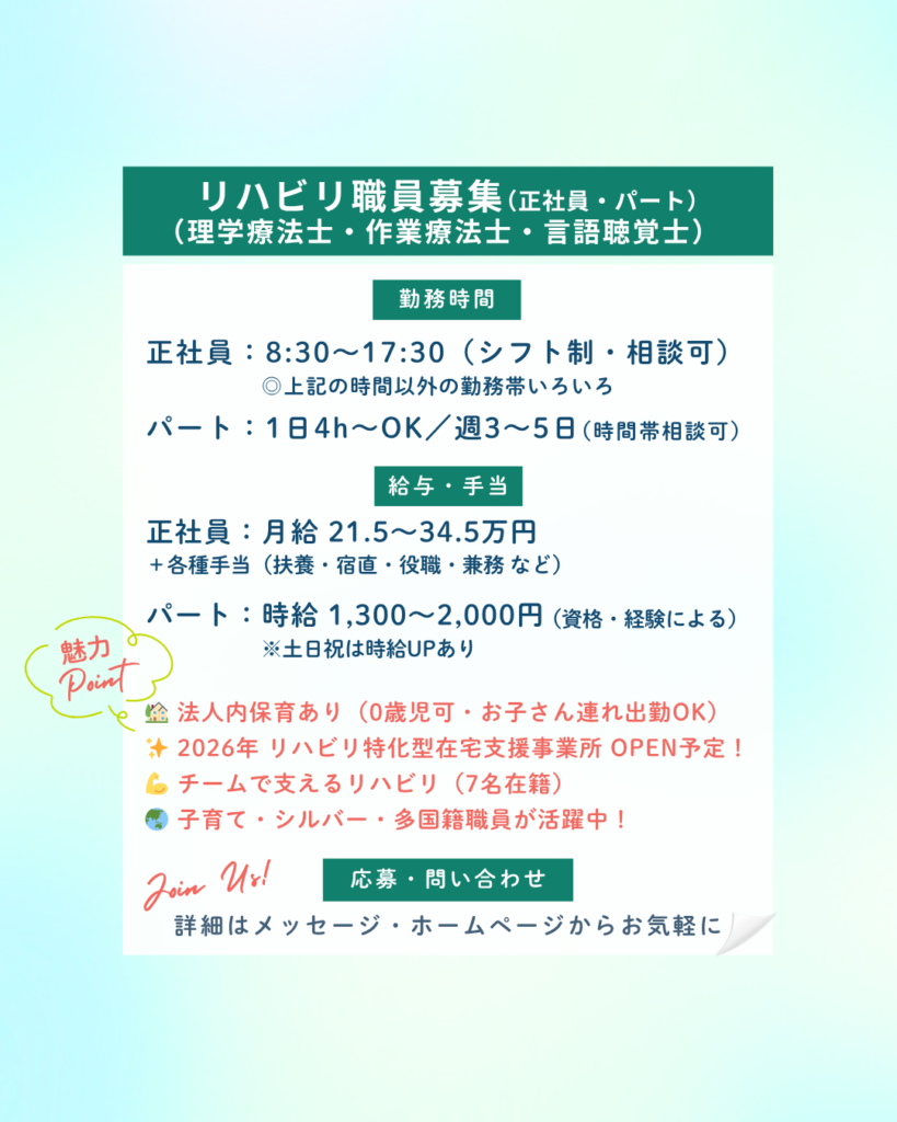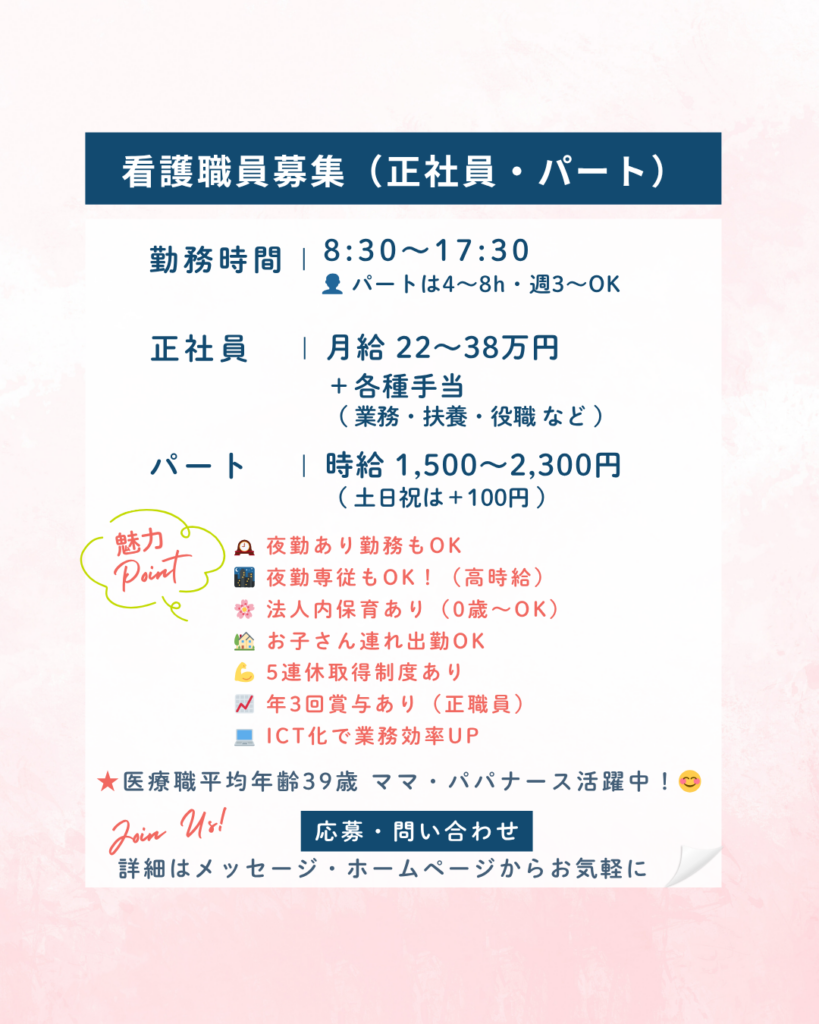- 🏡 法人内保育あり(お子さん連れ出勤OK)