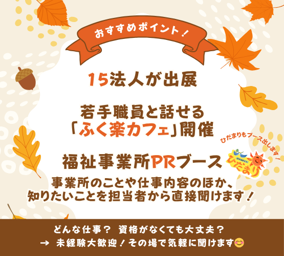 当日は、各法人の紹介ブースのほか、職員の生の声を聞ける「ふく楽カフェ」など、