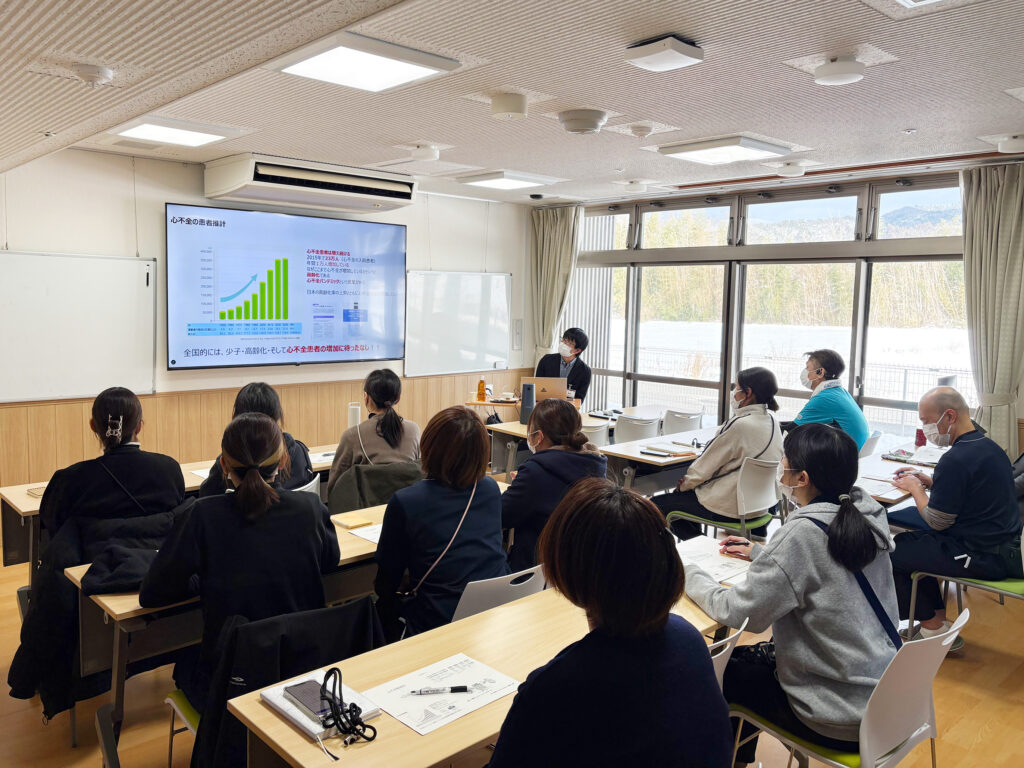 勉強会には、看護職員だけでなく、介護職員やケアマネジャーなど、職種の垣根を越えて20名を超える職員が参加し、心不全の患者推計や「そもそも心不全とは何か」といった基礎的な内容から、心不全が起こりやすい状況や日常の中で気づくべき変化について、具体的な事例を交えながら、丁寧で非常にわかりやすくご解説いただきました。