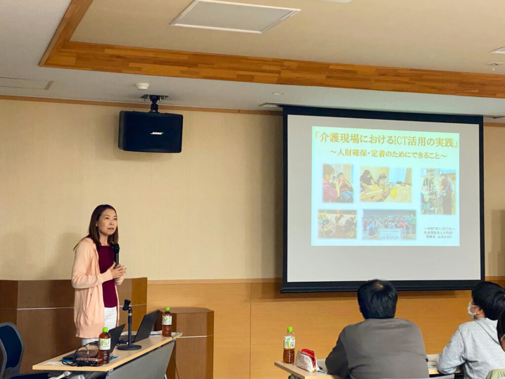 当法人からは、小規模多機能型居宅介護「はなれひだまり」管理者と理事長が登壇し、ICT活用の取り組みについて発表を行いました。
